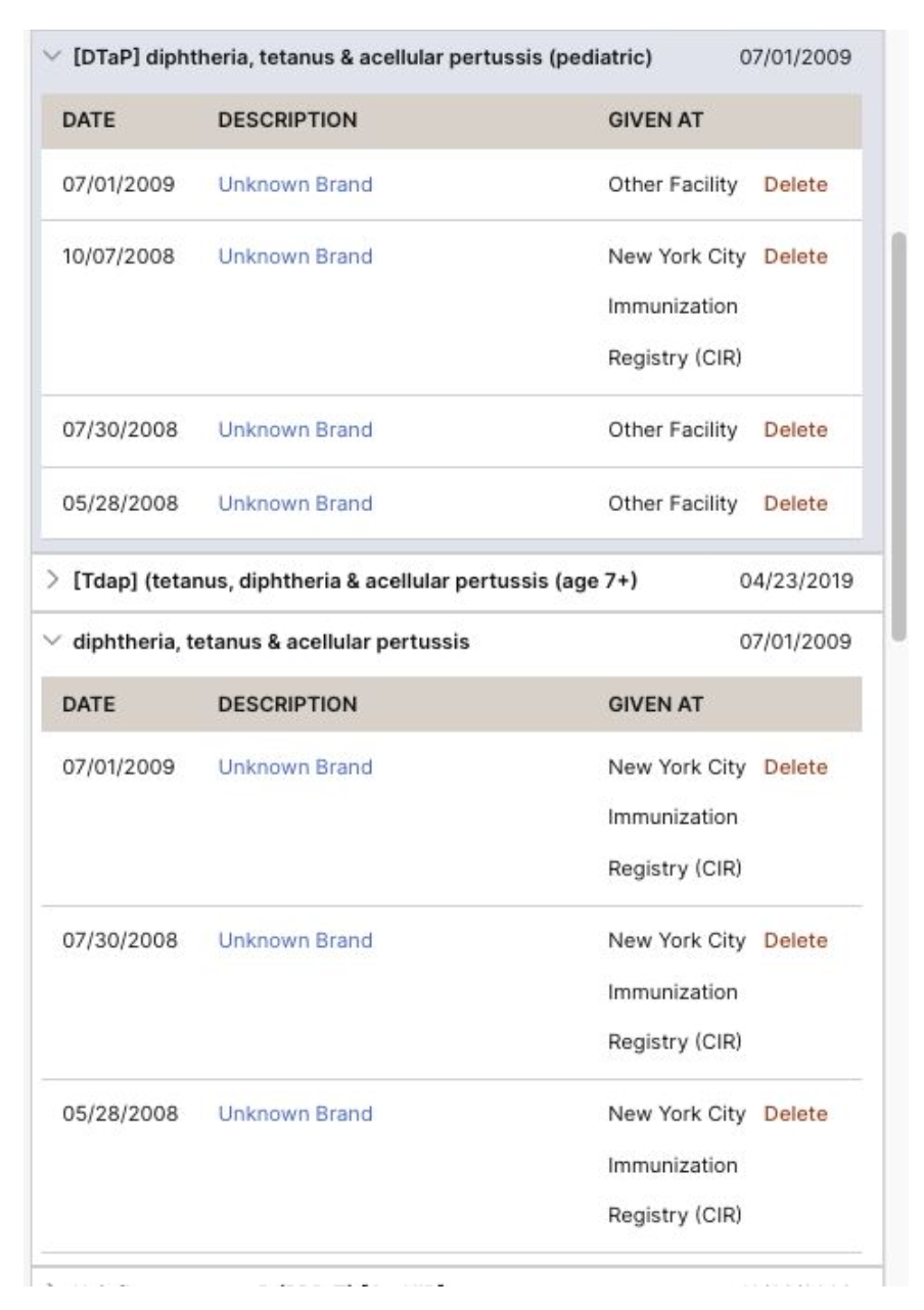 Existing display of immunization history that shows redundant entries